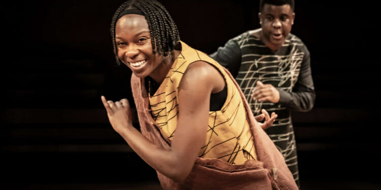 Kwame Kwei-Amah stages this piece on a striking set designed by architect Sir David Adjaye. A pyramid, centre stage, is dwarfed by its inverted twin, suspended above it. Projections swirl over its surface, of shimmering deserts, starry skies and, sometimes, accusatory faces spreading rumours. It is an impressively conceptual and ambitious set, although with the occasional hint of an Imax demonstration film. The sharp pyramid’s point helps to focus the action which is necessary, because the events of Sinuhe can be a little difficult to follow. This is not the fault of the cast, Joan Iyiola and Ashley Zhangazha who, at the start, play rock/scissors/stone to determined who plays Sinuhe, and who plays his spirit and all the other characters. They are full of energy, charming performers who fill the stage heroically as they struggle across the parched desert, muck out the stables of a Syrian monarch, fight the strongest man in the kingdom in single combat, marry the princess (Sinuhe is played by Iyiola and the princess by Zhangazha at this point, which throws a whole extra level of gender confusion in the story). They deliver an entertaining evening, appreciated by an audience who are only too happy to be able to close their eyes, as invited by Iyiola, and imagine themselves beside a campfire in the desert in 2000BC.