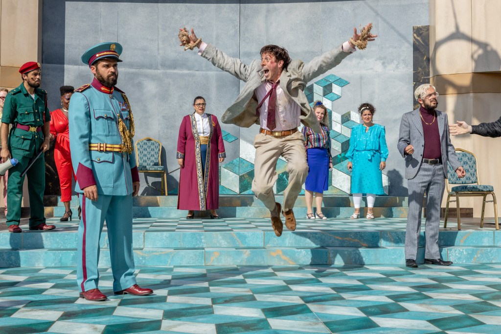 Breen and designer Max Jones have conjured a 1980s Ephesus, overrun with gleefully realized costumes. Dresses are teal, tights are cerise, shirts are splashed with geometric pastels, and braces are in evidence. Military uniforms are in fetching pale blue or green from a Tintin fantasy South American republic. Pale stone walls and a chequered marble floor suggest a Mediterranean setting, but the ambience is that of a parallel, heightened, frantic version of reality.