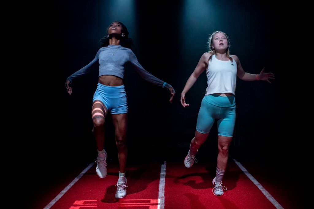 Ella Road’s new two-hander is set in the world of track athletics but the two characters, Ann (NicK King) and Sophie (Charlotte Beaumont) are not just any runners. They are young, promising, female 800m runners. They train under the instruction of an off-stage coach to fulfil their potential. If they do the reps, eat the right food and, above all, commit they can follow a pathway that goes from national to European to world championships and, eventually, the Olympics. At first Road’s play seems to be concerned with the friendship between two young women, sharing the particular pressures of pursuing a career in athletics alongside school and the pressures of growing up. Her writing is very engaging. We quickly feel we are witnessing the ups and downs and the shared experience of Ann and Sophie. The play’s structure is short and sharp, divided into the reps that govern their training. As the progress to championship level, they become closer, Sophie’s cockiness complementing Ann’s worried elegance. The play’s headline theme – gender definitions in athletics – is kept until daringly late, and therefore comes as a shock. Ann’s disqualification and the effective end of her career after her testosterone levels register too high for her to qualify as a female competitor, open up a gulf between the two. Road pulls off the difficult trick of dramatising an argument that is familiar from news headlines without allowing the debate on stage to seem contrived.