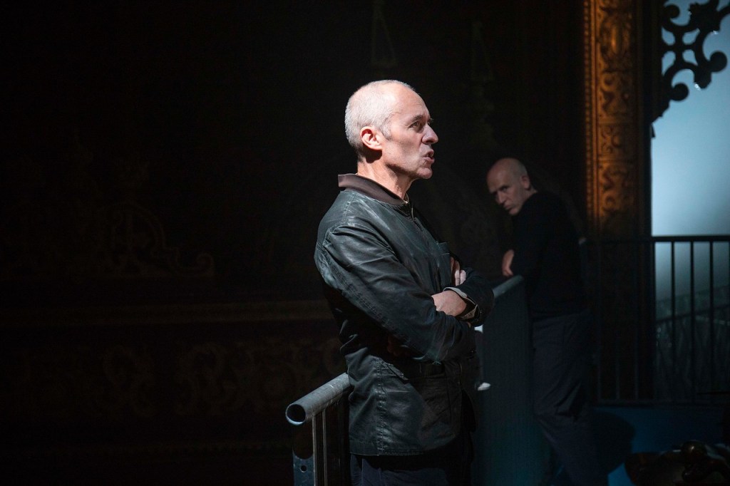 The production is directed and designed by Judith Hegarty Lovett, joint company director with Conor Lovett. Her vision is unmistakable, a staging that locates the two performers around the edges of the Coronet’s magnificently decayed auditorium. Dillane first appears draped at an uncomfortable angle over the aisle handrails, spotlit against flaking paintwork. He and Lovett perch awkwardly behind the orchestra, lie on the floor behind the gong racks, and appear in the audience. They are never centre-stage, as they struggle to communicate their bizarre predicament from the sidelines. Yet they cannot stop talking. The words flow from both without ceasing, beyond their control, and they spend around half the evening attempting to conclude what they have to say.