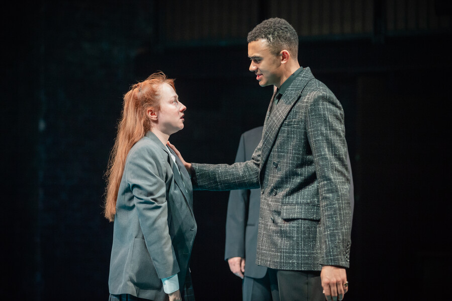 The programme focuses on the vulnerability of teens on the internet, which the production seems keen to use as a way to understand the young anti-lovers, Helena and Bertram. The staging uses back projections of social media posts and reels. As the play begins, this which works well with the online announcement of the of the Count of Roussillon’s off-stage demise. However, the idea never amounts to more than a series of interludes between scenes, and adds little to our understanding of the play.