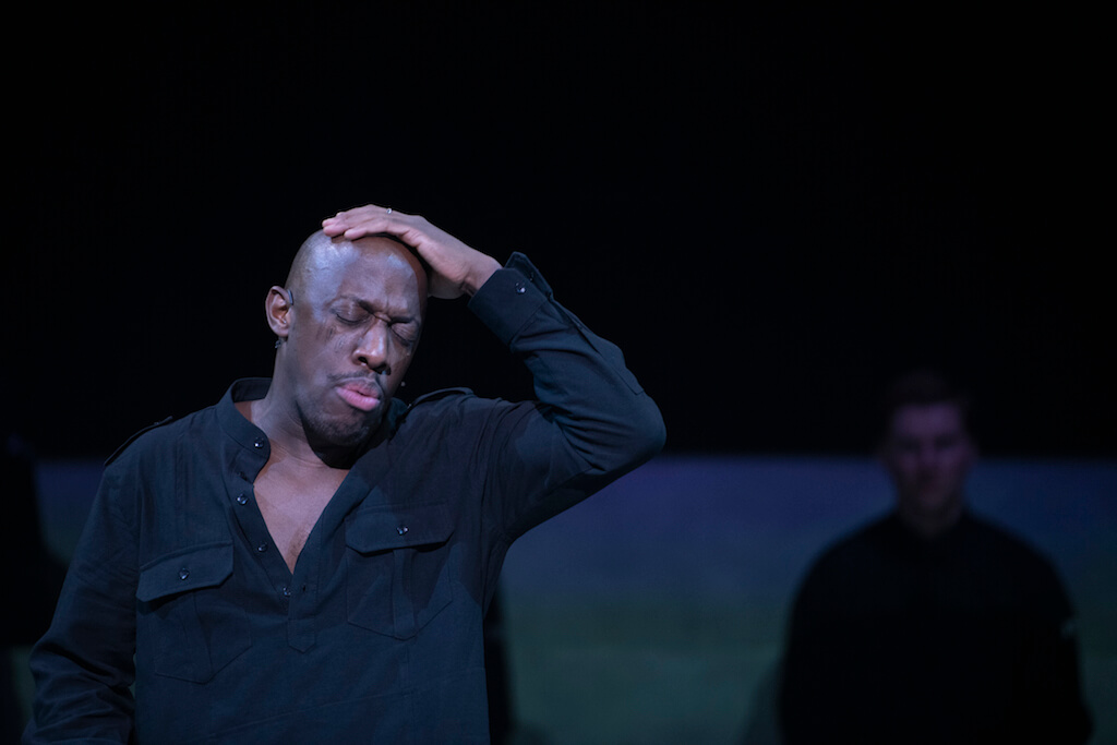 Giles Terera’s refined Othello seems aloof at first, separating himself from the oppressive Venetian world around him. It soon becomes clear this is his protection from a society that accepts his military skills and, in return, gives him contempt and worse. The Duke of Venice’s entourage, in fact almost everyone in the play, is in black-shirt uniforms and go about wielding burning torches, like an incipient lynch mob. Paul Hilton’s twisted, sadistic Iago is a military man through and through, a sergeant major who embodies the attitudes of the system he serves. In his military moustached, he bears a striking resemblance to Enoch Powell, played upon in the first scene when he puts on a West Midlands accent as he leads a baying mob to the Duke’s door. He is also an arrogant wife-beater (Tanya Franks’ Emilia appears with a bruise across one cheek) and con-man, his mouth constantly curdling into a sneer. But, in targeting Othello he is simply putting the culture of Venice into action.