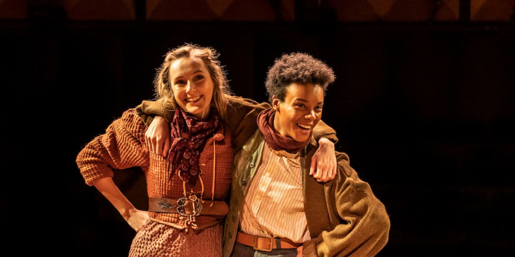 The star of the show is, unusually, Celia, played by deaf actor Rose Ayling-Ellis. Supported by subtitles at circle level, she signs her part and delivers a performance of great charm. Her presence, far from seeming an add-on, is integral to Rourke’s interpretation. Not only does she sign with Rosalind (Leah Harvey), but so do other members to one another as everyone tries to communicate across the voids created by love – unrequited, confused, or unacknowledged. Celia is the sensible one, signing her bafflement at Rosalind’s increasingly bizarre plans to court Orlando (Alfred Enoch), while Harvey’s Rosalind is unmoored by love, fully committed to the fantasy forest existence. Harvey’s gender identity – her biography specifies the pronouns ‘they/them’ – adds a further layer of ambiguity to the gender swapped drama, which seems relevant to our times in way that were not apparent until recently.