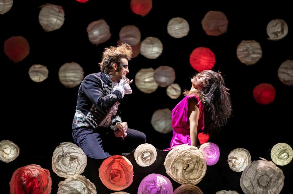 Yaël Farber’s production of The Winter’s Tale is played against the backdrop of a giant, three-dimensional moon. It glows pale white or blood red to signify the contrasting locations in the play: Sicily and Bohemia. Soutra Gilmour’s designs, both set and costumes support an interpretation which has pace and coherence, which can easily vanish with the complete shift in setting and characters that occurs between Act III and Act IV. The early scenes of jealousy, as Leontes pulls apart the lives of those around him, are staged in an almost noir context, with a barefoot king and queen in loose grey clothing. The intensity is completely gripping, in some of Shakespeare’s most driven and desparate scenes. Bertie Carvel’s Leontes is rangy and wired, his paranoia entirely convincing. John Light’s Polixenes, the object of his irrational hatred, is outwardly jovial but wary just below the surface. Madeleine Appiah’s Hermione is full of goodwill, which makes her destruction all the more unbearable. Her trial scene, where she defends herself with patches on her dress from lactation, having just given birth, is very upsetting.